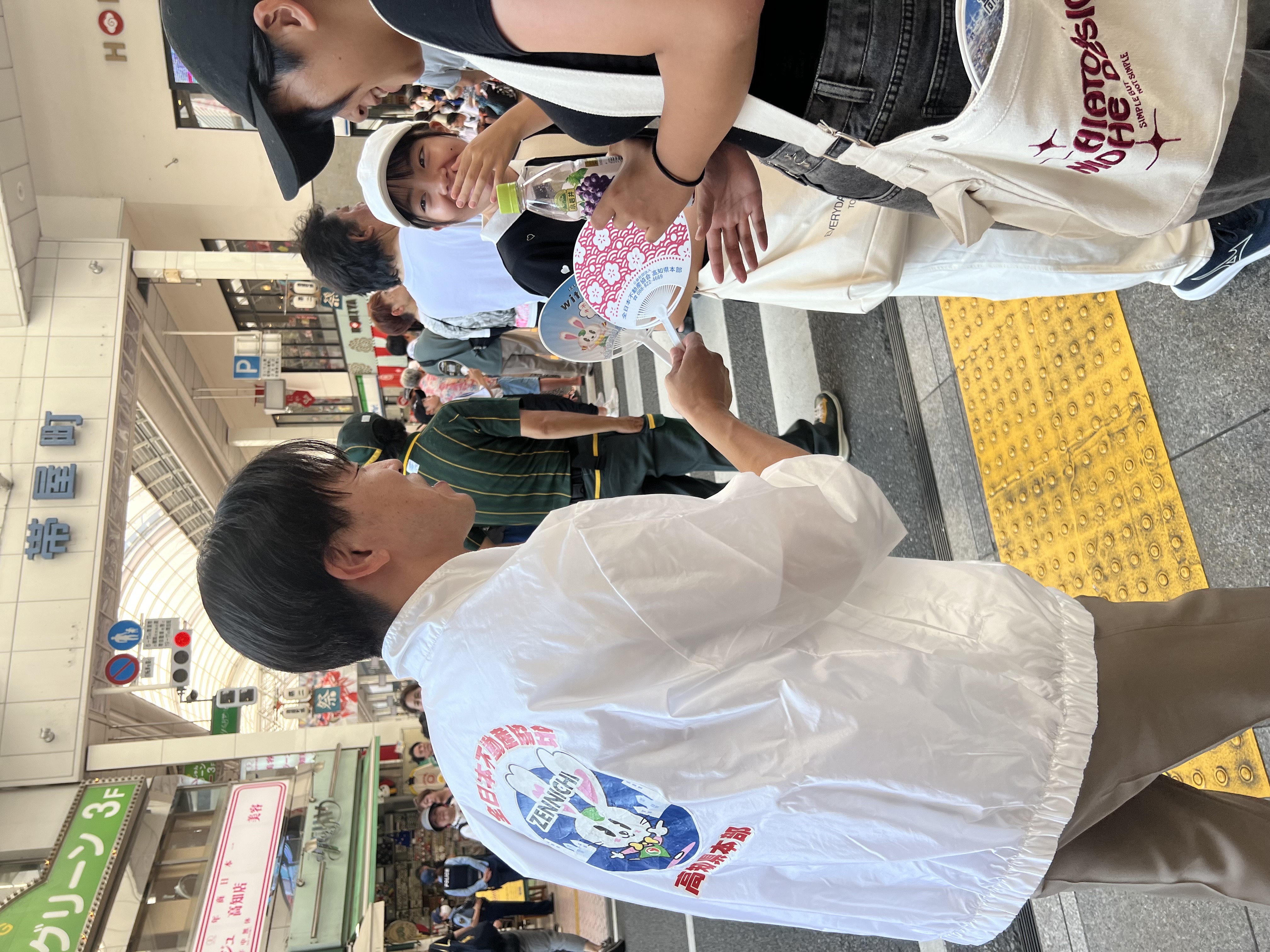 青年部会は、「第72回高知よさこい祭り」にて、恒例行事となりつつある全日高知県本部PR活動の一環として、うちわ配りを実施しました。青年部が揃いの全日ジャンパーを着用し、高知県本部を出発。帯屋町演舞場を中心に、西方面組と東方面組に分かれて「全日高知」のPRを行いながら、来場者へ笑顔でうちわを配布しました。